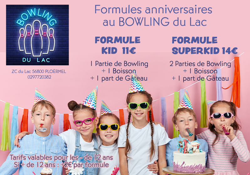 Vous pouvez également opter pour la formule SUPERKID à 14€ par enfant. Cette formule propose 2 parties de bowling avec location de chaussures, le gâteau d’anniversaire et une boisson.